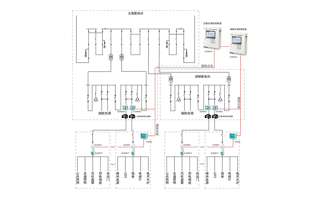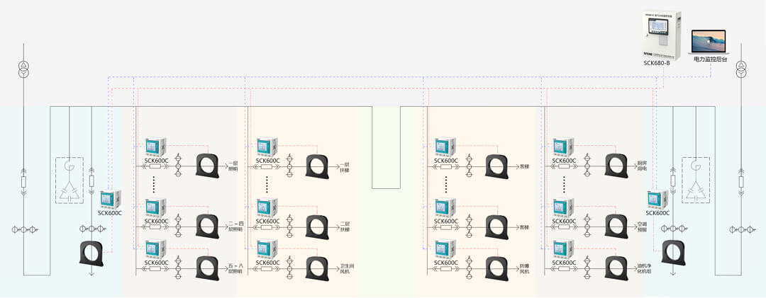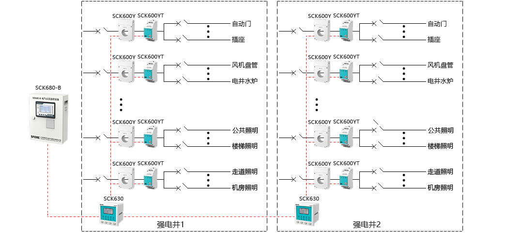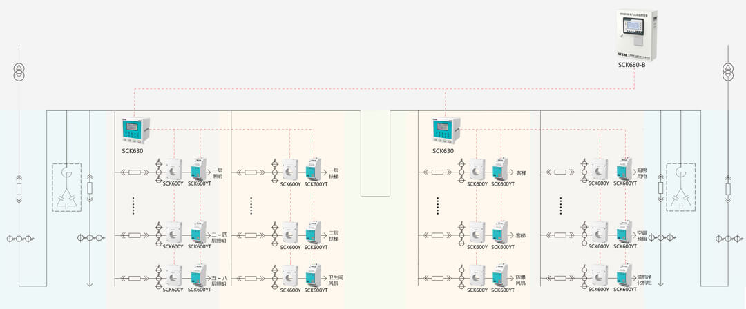 當供電線路泄漏電流大于500mA時,需在其下一級配電箱設置電氣火災監控探測器。可在每個配電箱內安裝一個SCK600Y一體式電氣火災監控探測器、SCK600YT測溫式電氣火災監控探測器和NTC溫度傳感器,一層樓或一個強電井配置一臺SCK630監控單元。