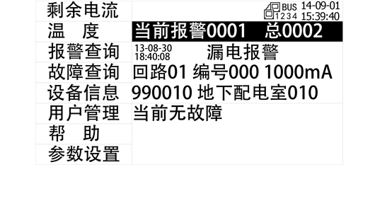 系統支持對剩余電流和溫度報警值以及各類回路信息和狀態進行遠程設定。當回路發生報警時,系統發出聲光報警信號,并自動進行詳盡順序的事件記錄。