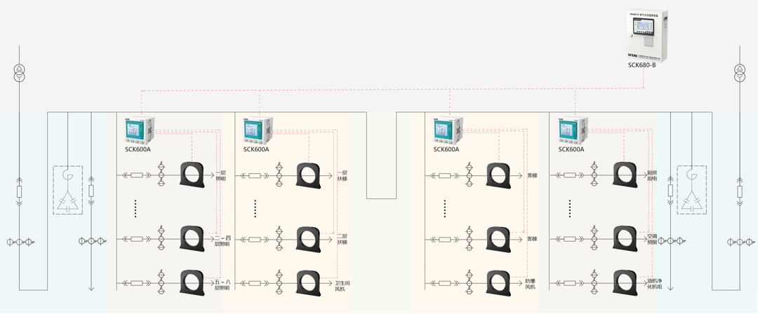 在饋線柜每個回路安裝一個SCK600Y剩余電流式電氣火災監控探測器、SCK600YT測溫式電氣火災監控探測器和NTC溫度傳感器,一排或多個配電柜配置一臺SCK630監控單元。