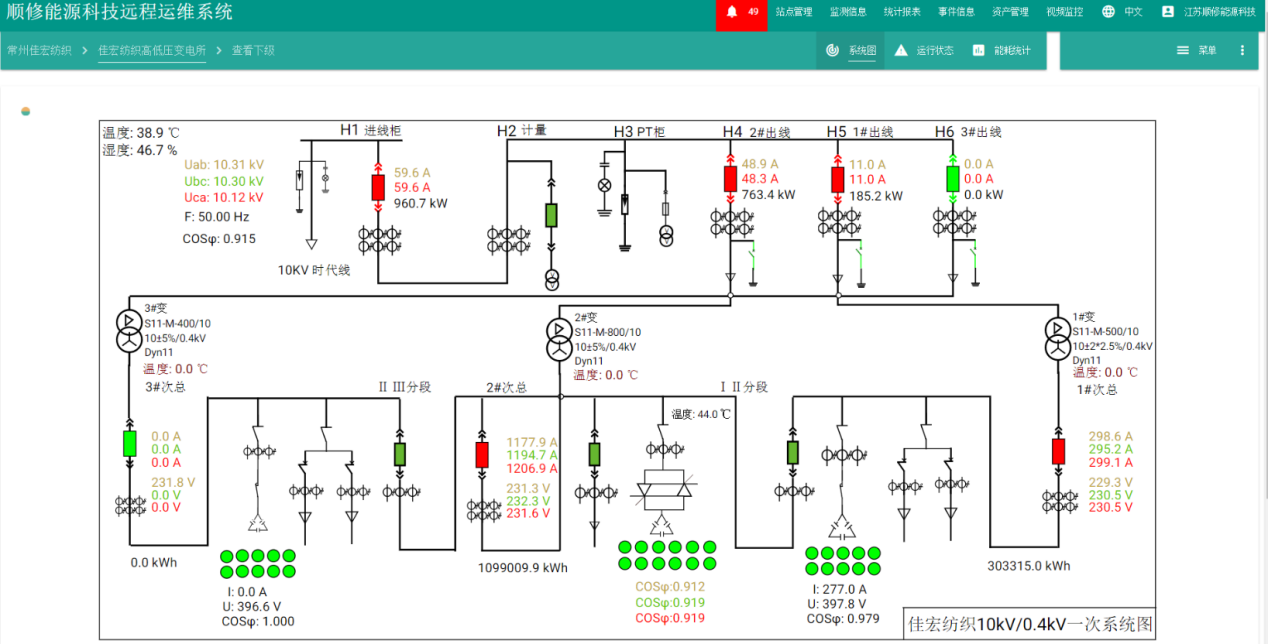 用戶可通過變配電系統一次圖,直觀、實時的了解高低壓回路開關的狀態,以及回路電流、電壓、功率等電量參數。
