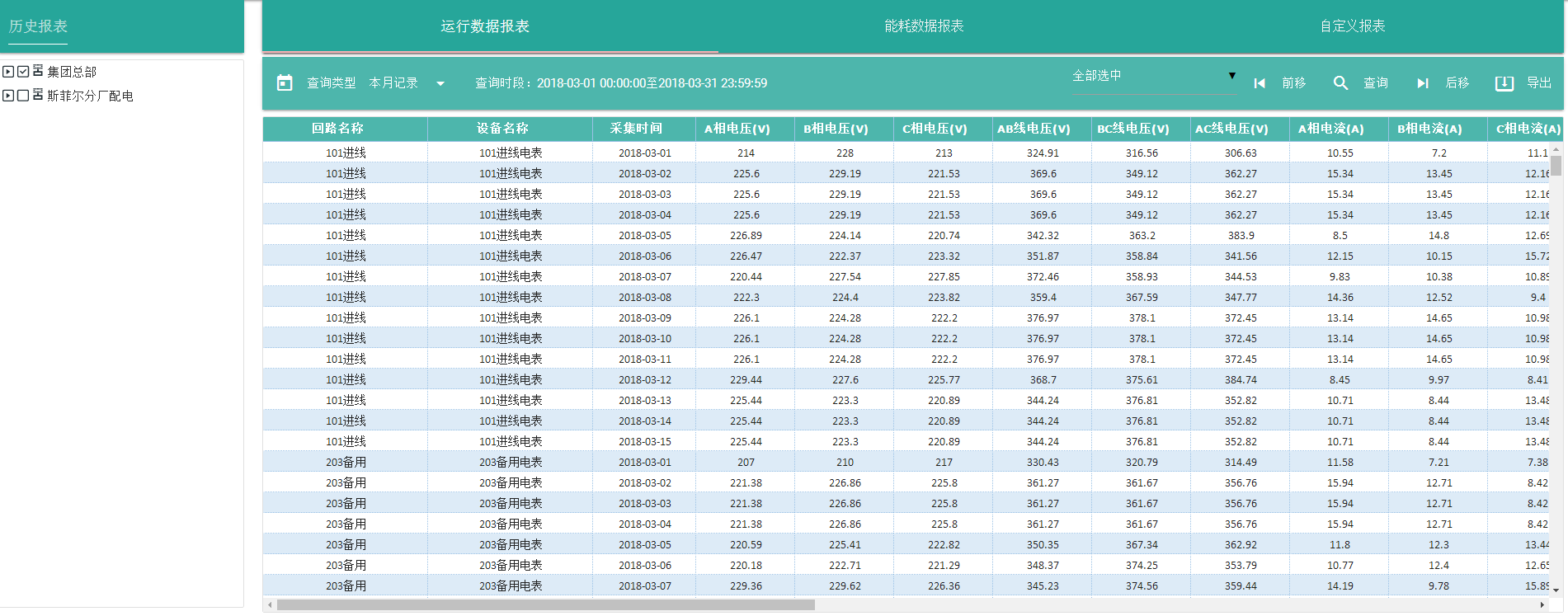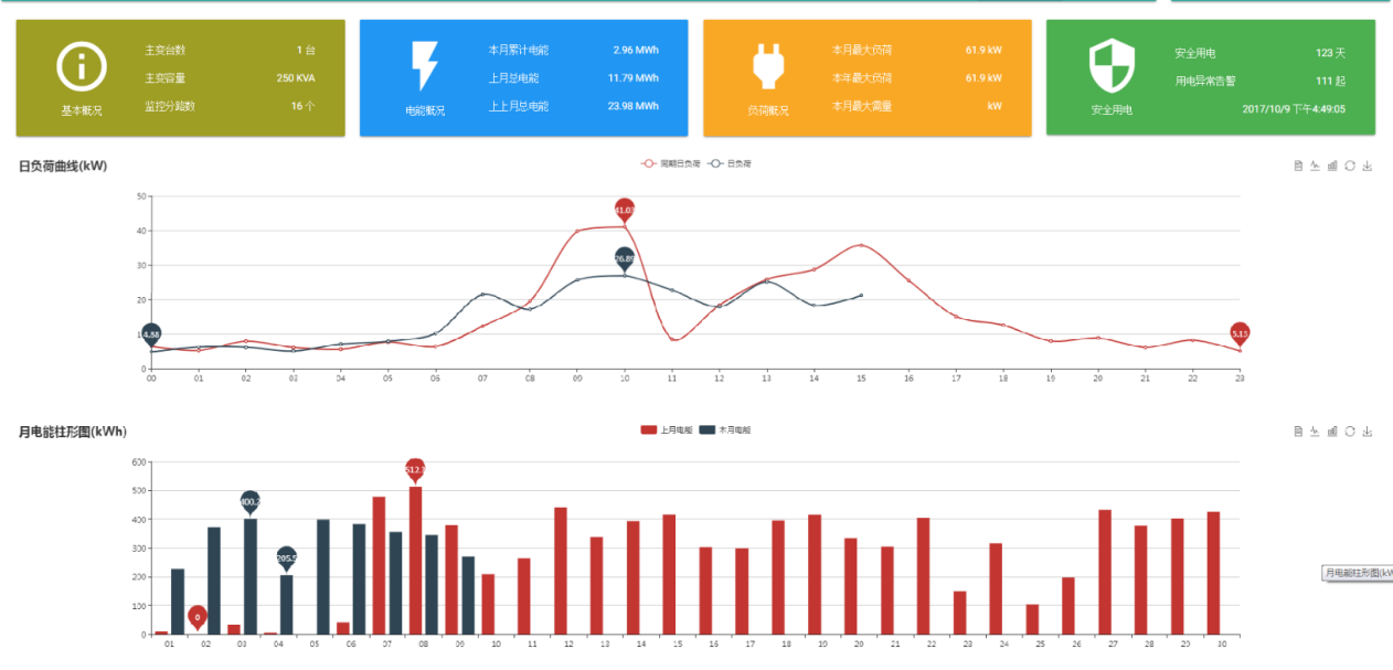 系統可提供日報表、季報表、月報表、年報表等個類報表,方便供用戶對電流、電壓、功率負荷、電能計量等歷史數據進行查詢、統計和分析。