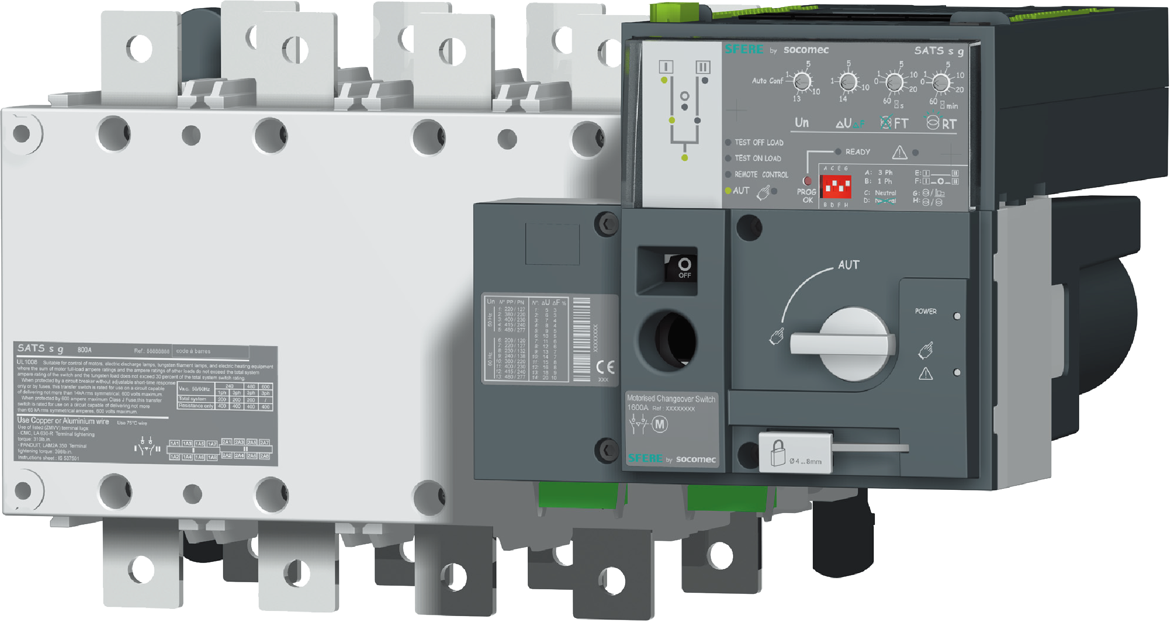 ? 在自動模式中,通過4個電位器和4個撥碼開關配置的參數,監控和帶負荷切換兩路電源。